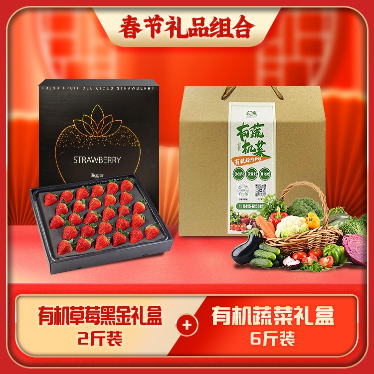 【2026春节年货礼品组合】6斤装有机蔬菜精品礼盒+丹东有机九九草莓黑金礼盒(2斤)